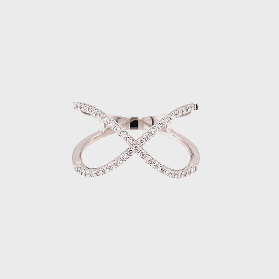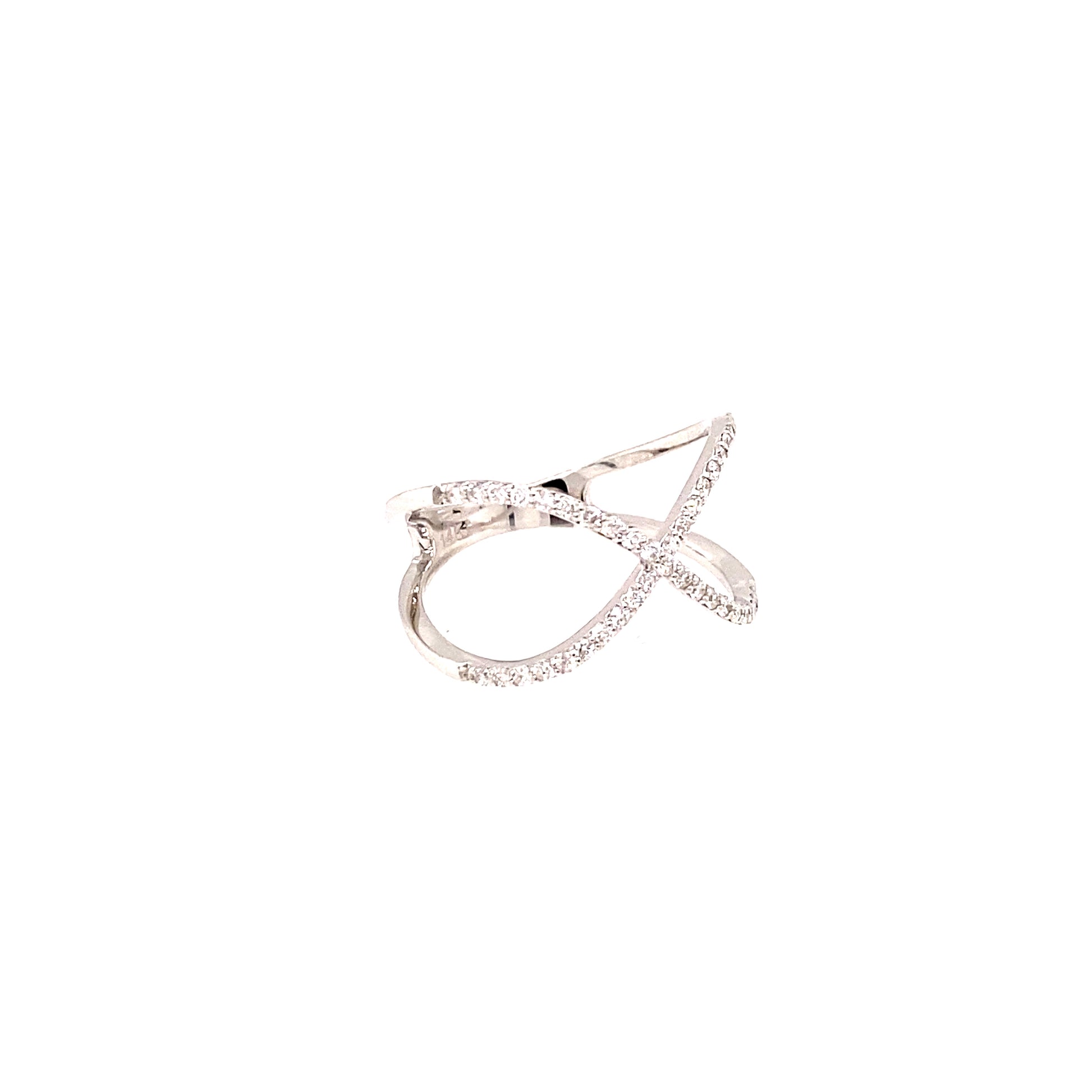 Modern crossover band in14K white gold with diamonds on the top portion of the ring.
