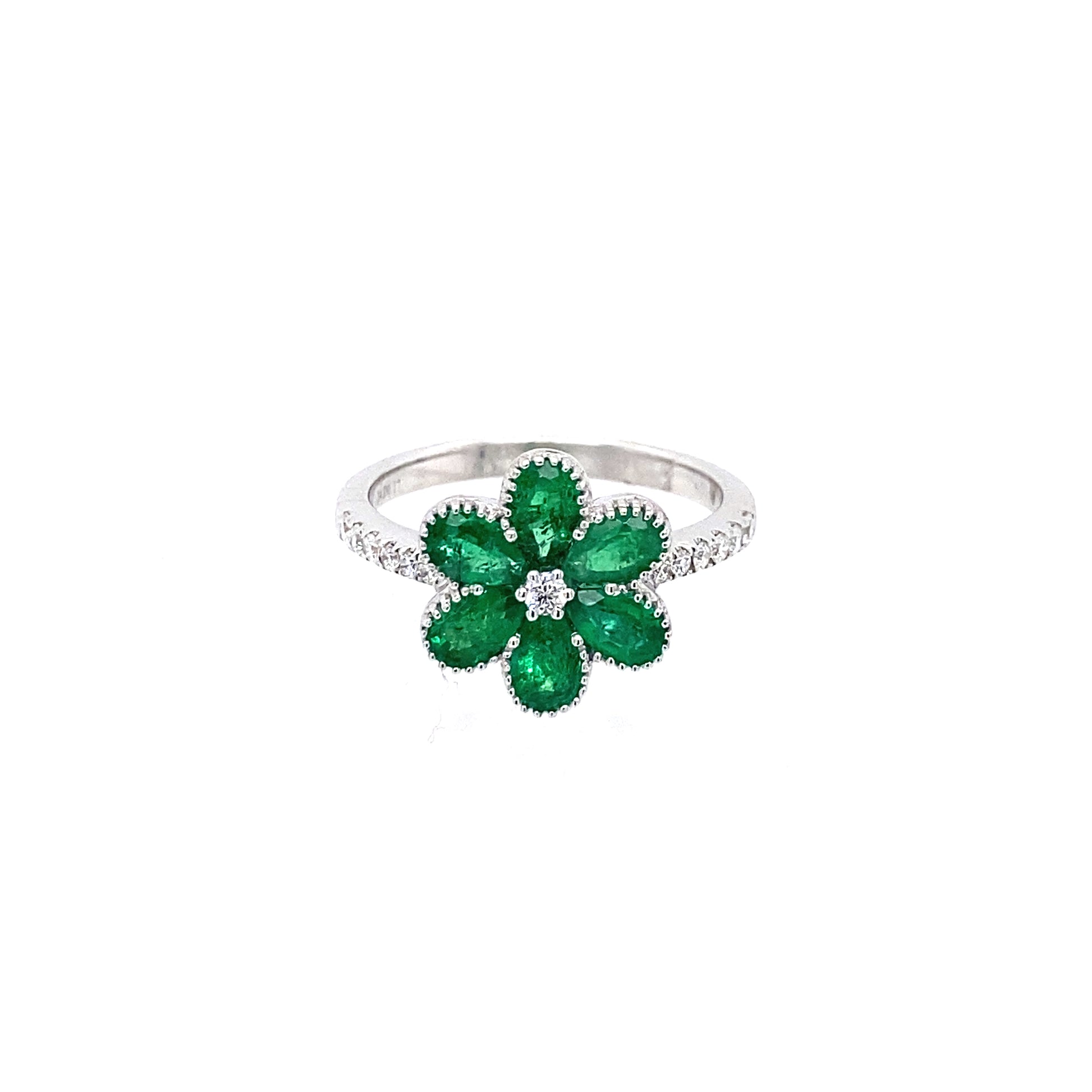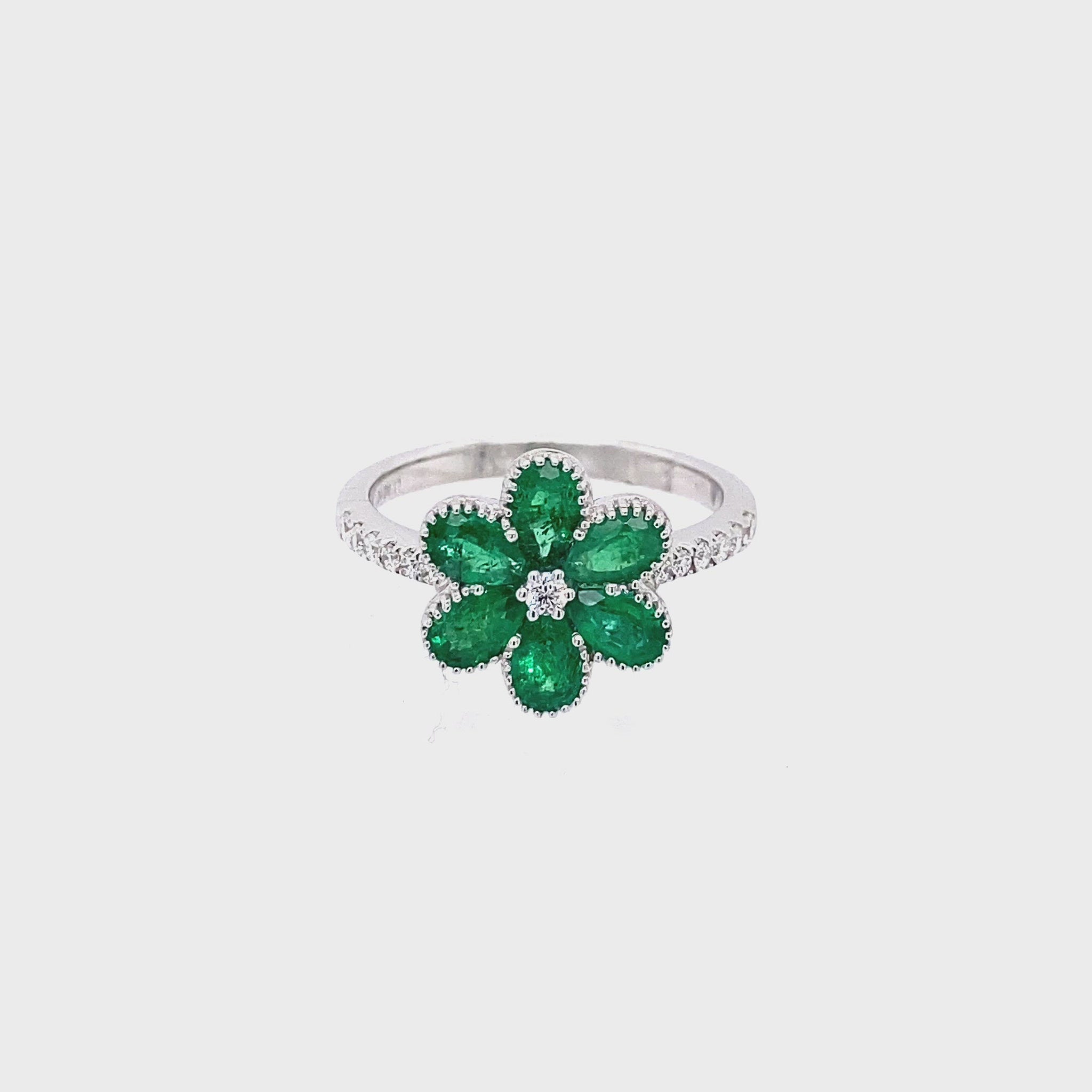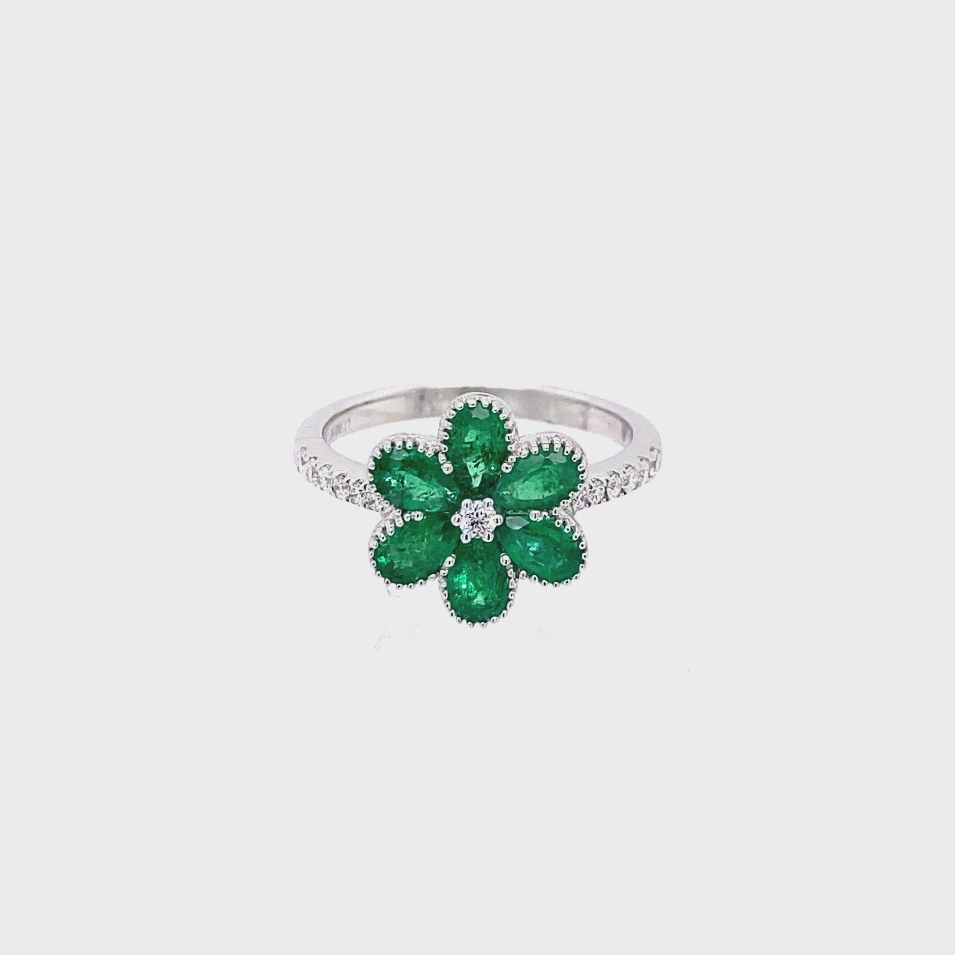 Six emeralds measuring approx. 3mm x 5mm each that are pear shaped, make up the flower petals. The center of the ring contains a round diamond that is 2mm. On each side of the band there is 6 round diamonds that are 1.5mm each.